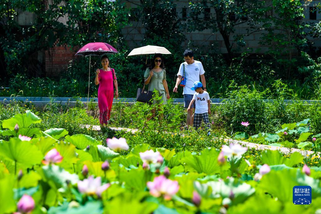 8月3日,游客在重慶市萬州區恒合土家族鄉石坪村“荷花廊道”游覽。