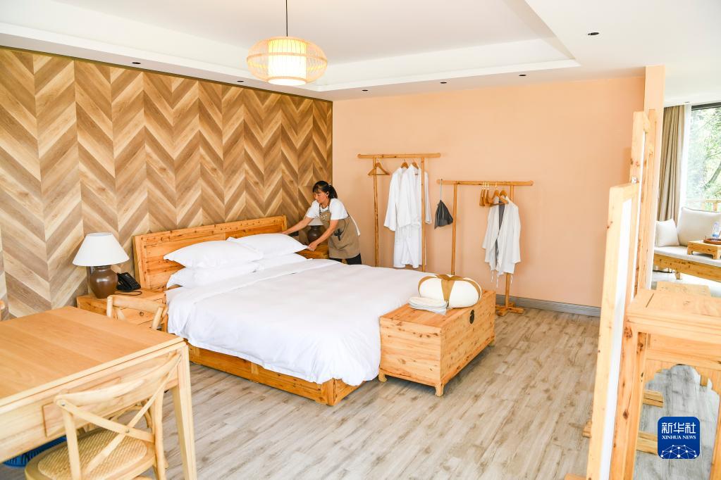 8月2日,重慶萬州三峽恒合旅游度假區(qū)一家民宿的工作人員在整理房間。