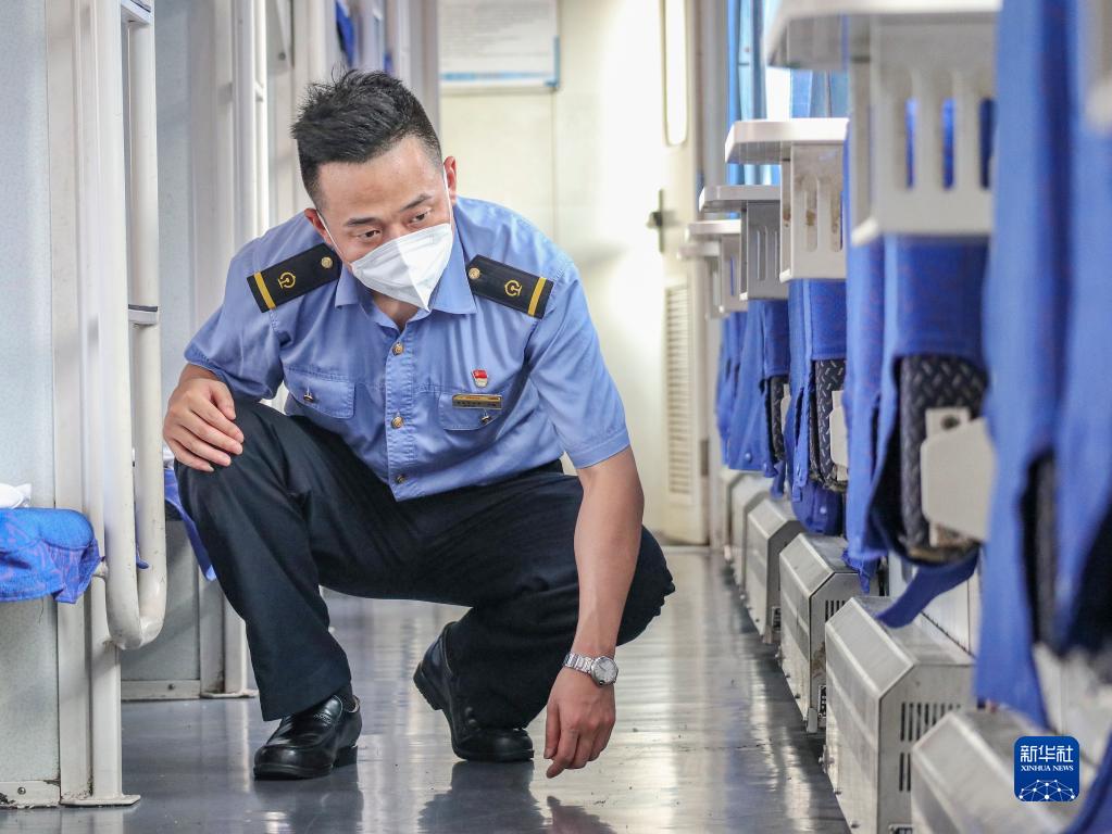 8月5日,在重慶西客車整備所,守車車長丁璐在庫內對K1153次列車全列隱蔽部位進行檢查。