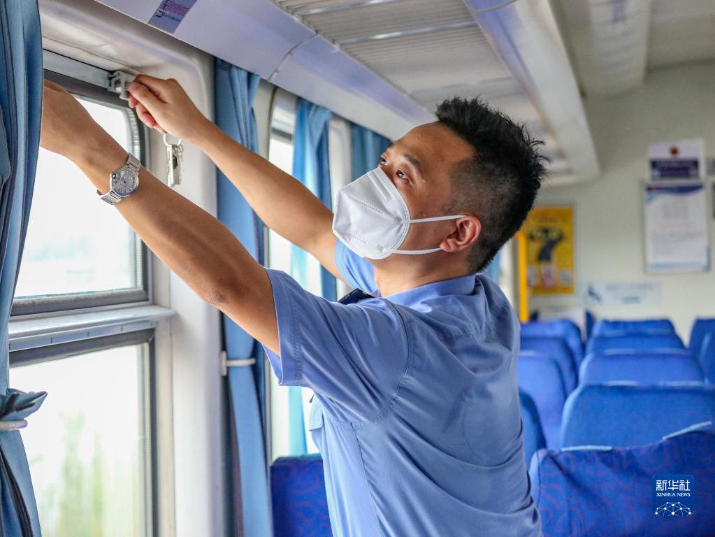8月5日,在重慶西客車整備所,守車車長丁璐對車內(nèi)車窗鎖閉情況進行檢查。