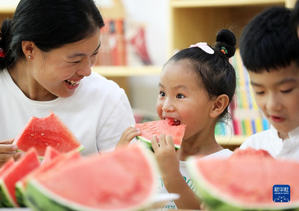 8月6日,山東省臨沂市郯城縣郯城街道龍泉社區(qū)居民與孩子一起吃西瓜“啃秋”。