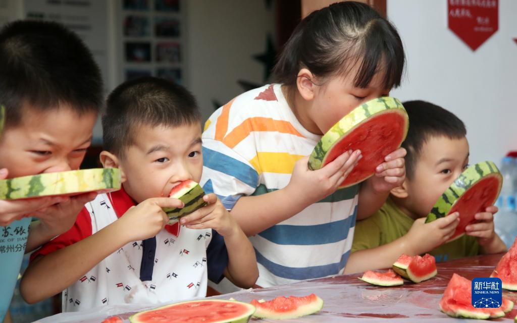 8月6日,在江蘇省常州市荷花池街道機(jī)械二村社區(qū),小朋友們?cè)诔晕鞴稀翱星铩薄?/p>