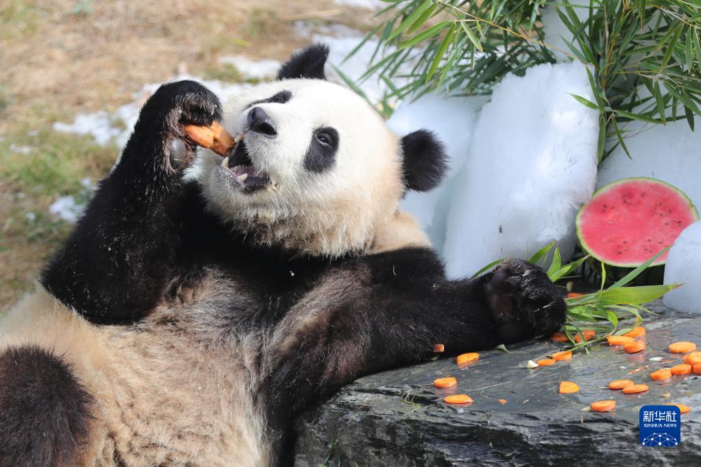 8月6日,在比利時布呂熱萊特的天堂動物園,大熊貓“寶弟”享用“生日大餐”。