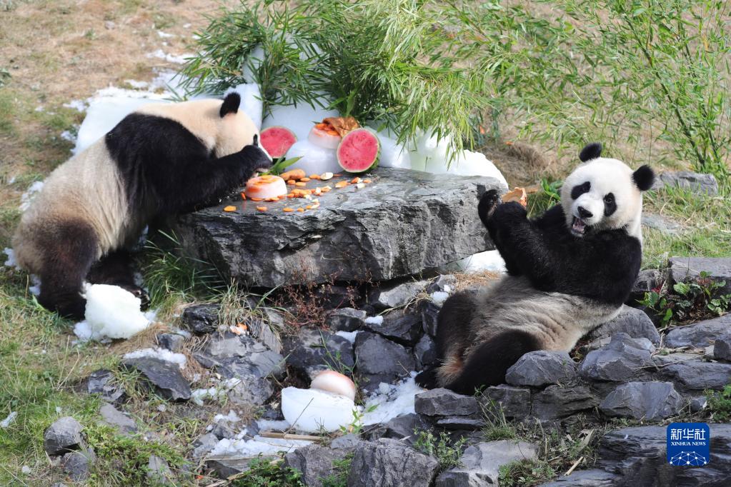 8月6日,在比利時布呂熱萊特的天堂動物園,大熊貓“寶弟”(左)、“寶妹”享用“生日大餐”。