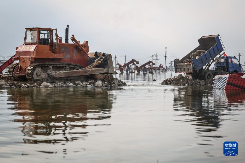 8月6日,搶險人員在潰口處進行封堵作業。