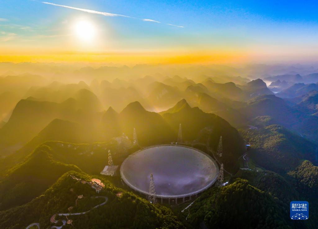 晨曦中的“中國天眼”全景(無人機照片,2022年7月25日維護保養期間拍攝)。