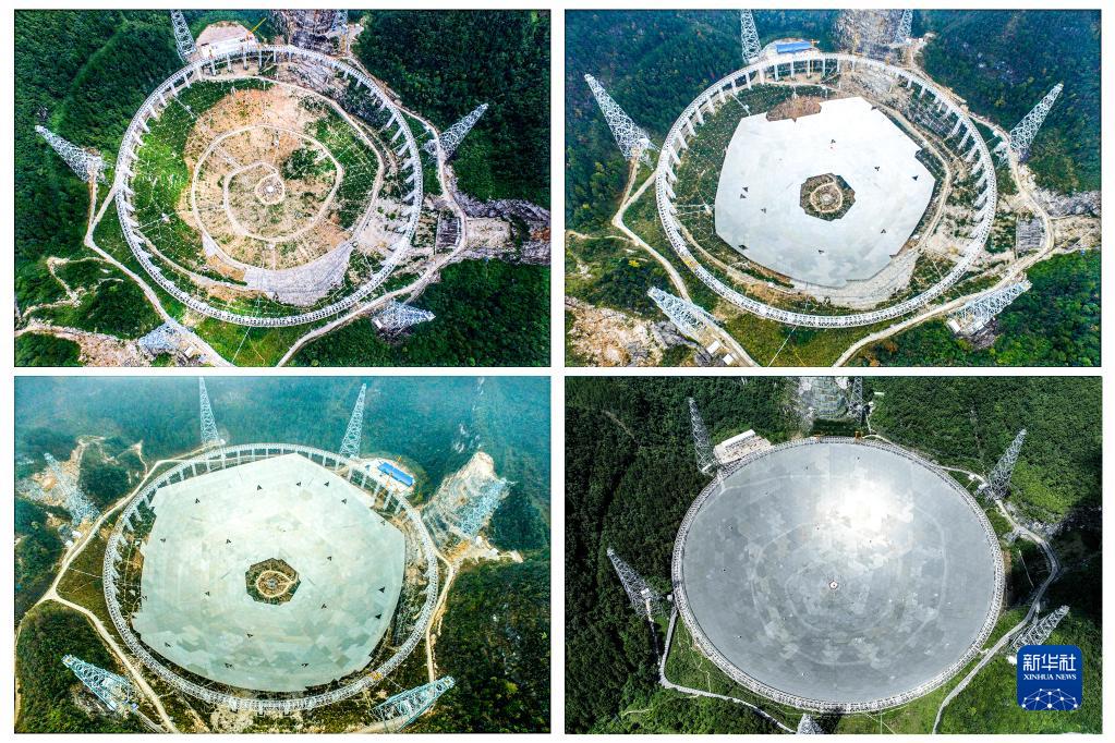 拼版照片:左上為“中國(guó)天眼”拼裝第一塊反射面板(無(wú)人機(jī)照片,2015年8月2日攝);右上為“中國(guó)天眼”反射面板安裝近半(無(wú)人機(jī)照片,2015年12月16日攝);左下為“中國(guó)天眼”反射面板安裝近八成(無(wú)人機(jī)照片,2016年3月9日攝);右下為2022年7月21日拍攝的“中國(guó)天眼”全景(無(wú)人機(jī)照片,維護(hù)保養(yǎng)期間拍攝)。