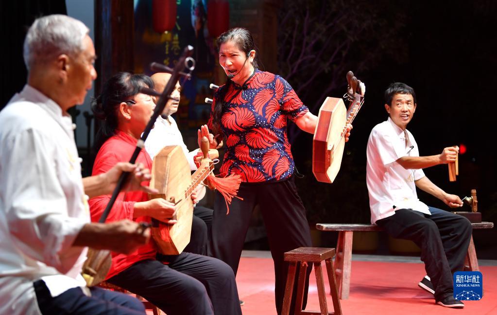 在西安周至水街煙火巷子,演員在表演華陰老腔(8月6日攝)。