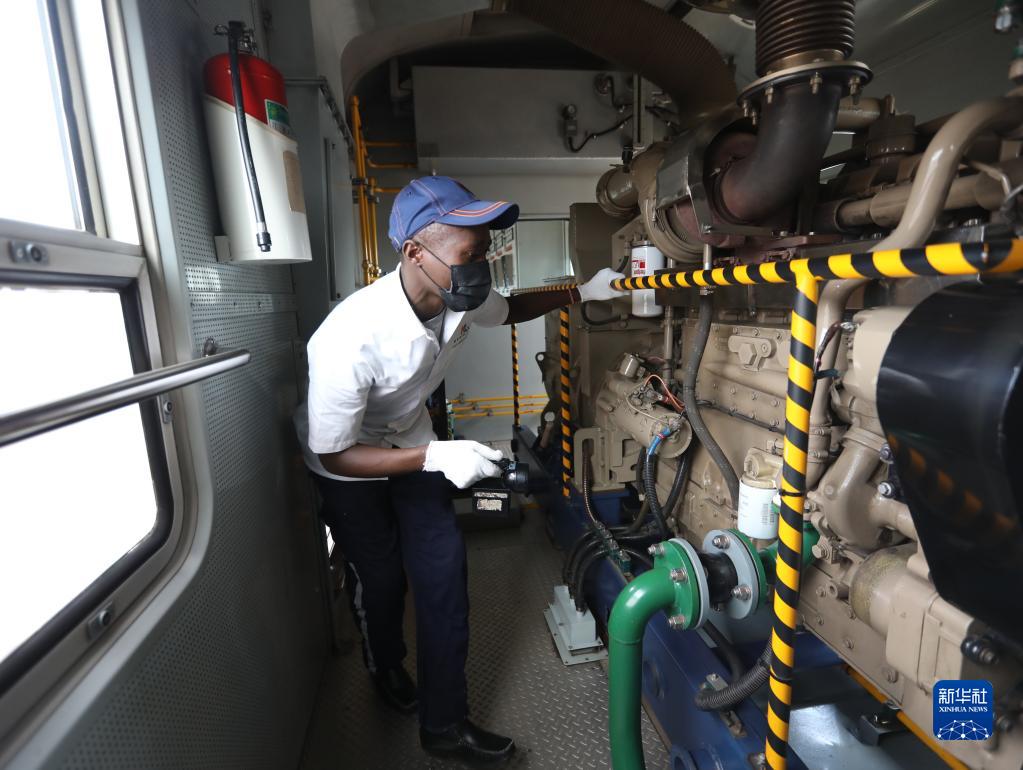 7月29日,發電車乘務員福斯汀在肯尼亞蒙內鐵路客運列車上檢查設備。