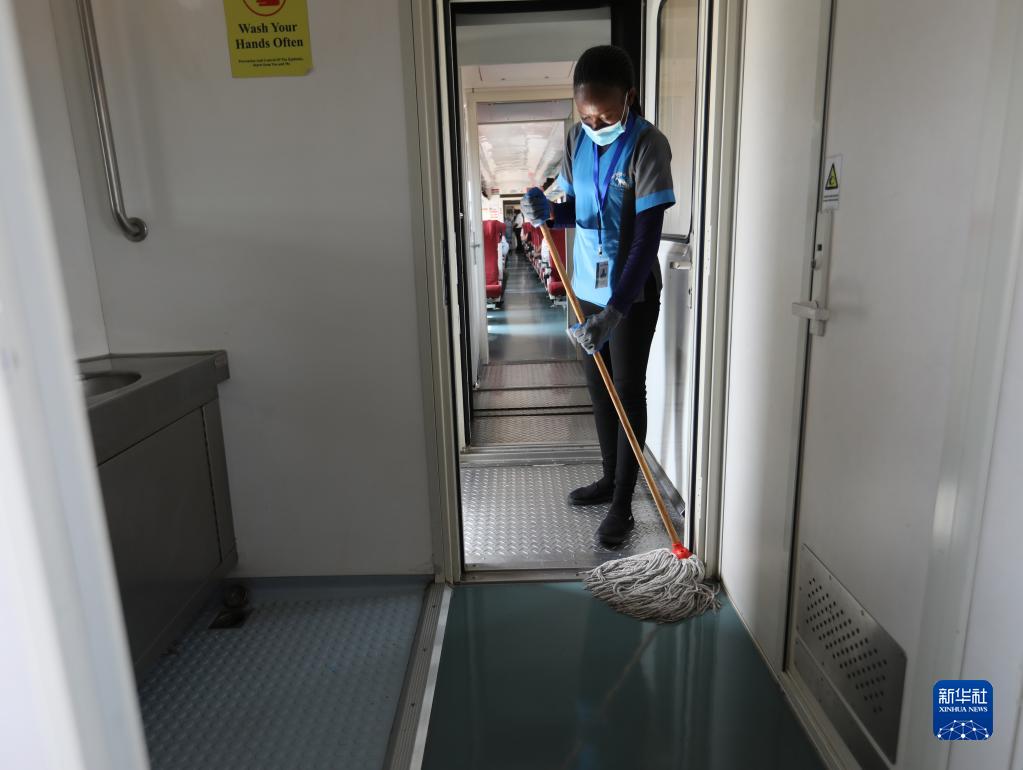 7月29日,清潔工莫希在肯尼亞蒙內(nèi)鐵路客運列車上打掃衛(wèi)生。