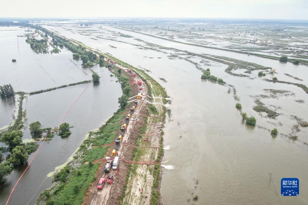 8月7日,搶險人員在遼寧盤錦繞陽河左岸曾經的河堤潰口北段進行排澇作業(無人機照片)。