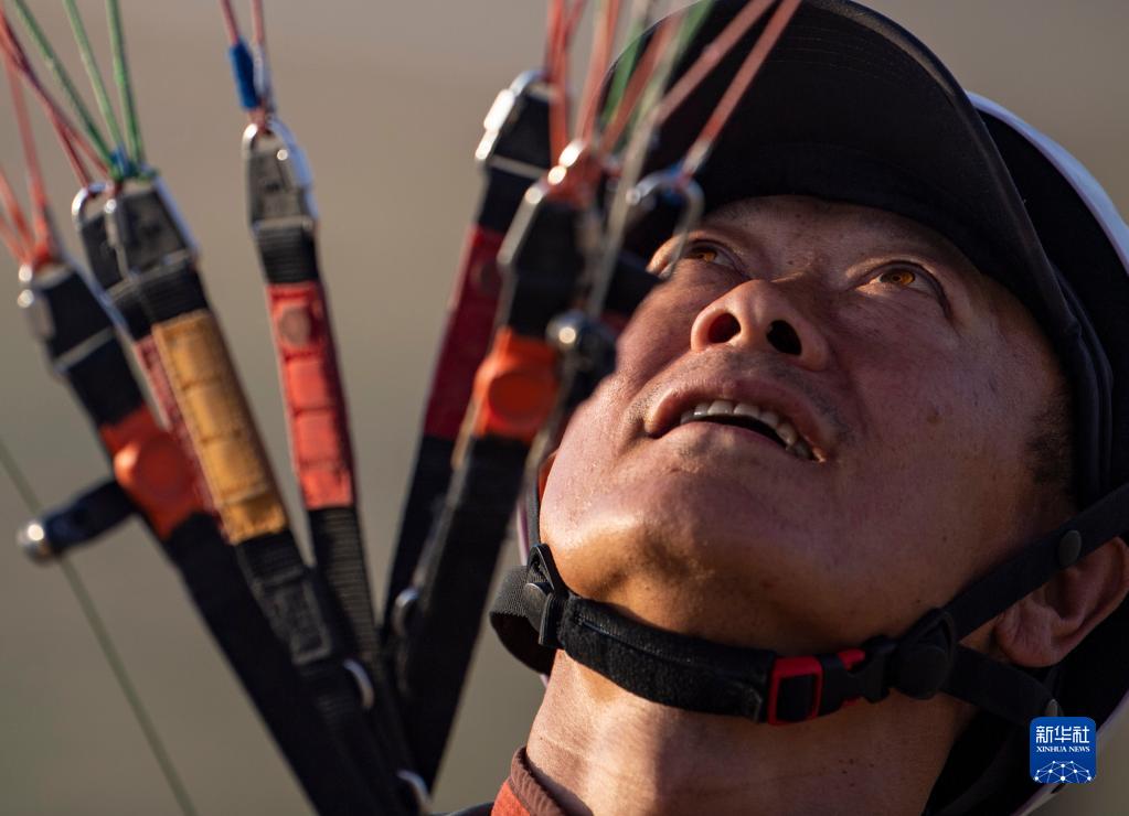 在新疆烏魯木齊市南郊山間,陳瑞峰在飛行訓練時,將傘牢牢控制在頭頂(6月11日攝)。新華社記者 胡虎虎 攝