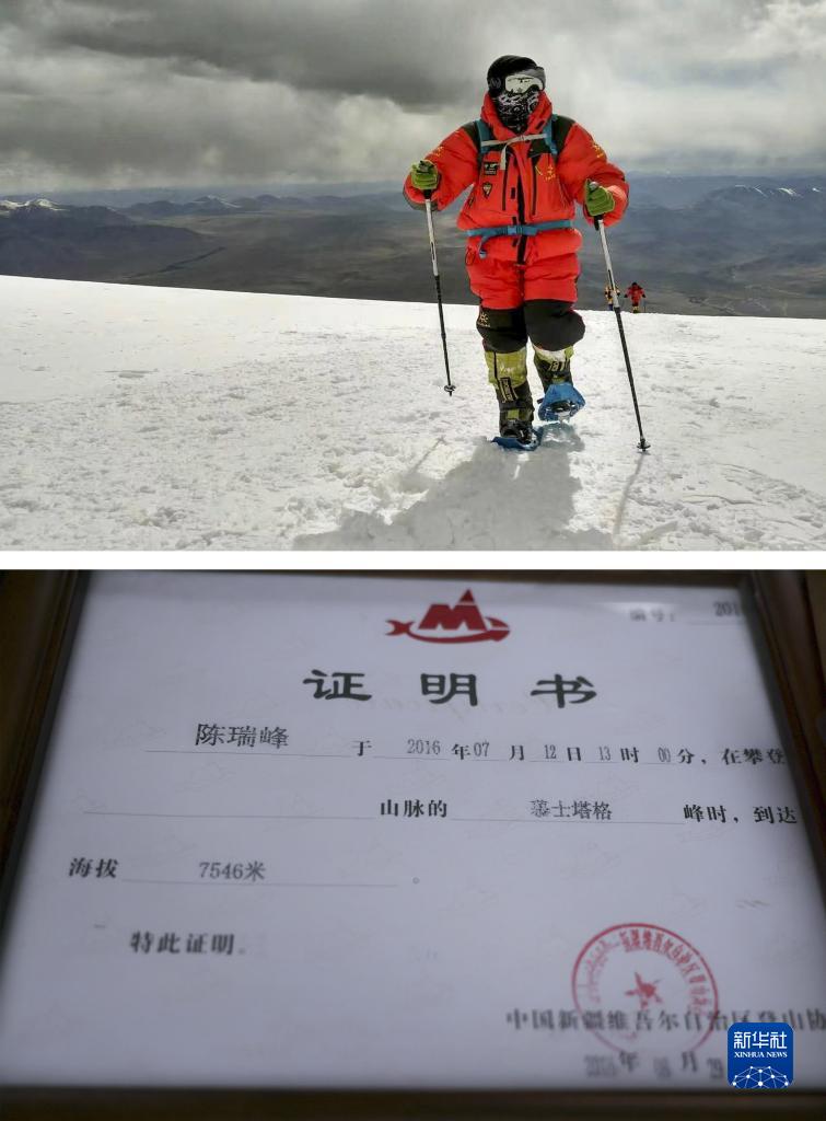 拼版照片:上圖為陳瑞峰在2016年7月攀登海拔7500多米的慕士塔格峰時的留影(受訪者供圖);下圖為2022年6月14日翻拍的陳瑞峰登頂慕士塔格峰證書(新華社記者 胡虎虎 攝)。新華社發