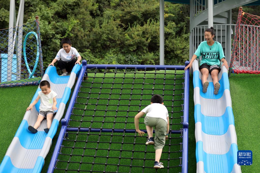 8月8日,小朋友在灤平縣熱河中藥花海小鎮(zhèn)一處游樂(lè)園休閑游玩。