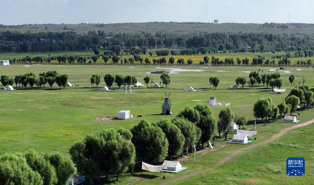 游人在神木市爾林兔大草原露營(8月5日攝,無人機照片)。爾林兔鎮對荒蕪的沙地進行保護性開發,建成萬畝大草原,成了美麗的旅游休閑之地。