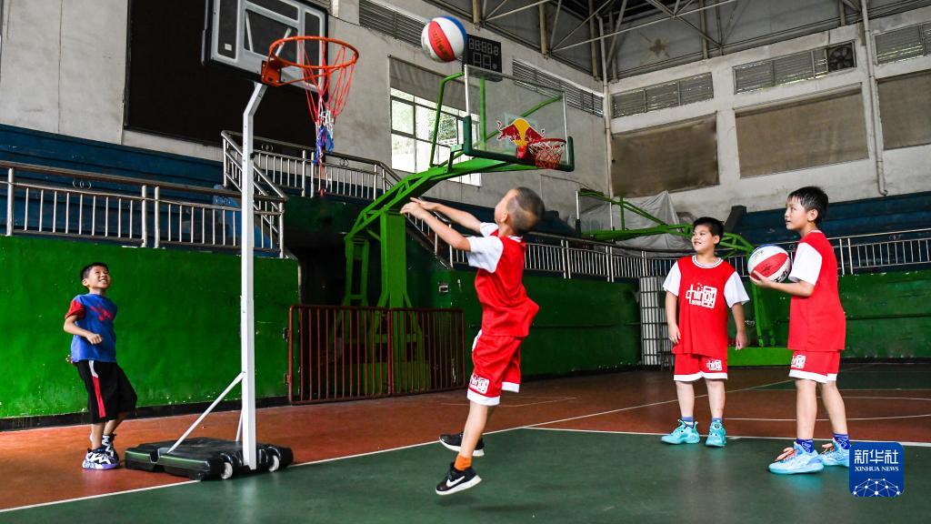8月8日,孩子們在湖南省常寧市泉峰公園籃球場打籃球。