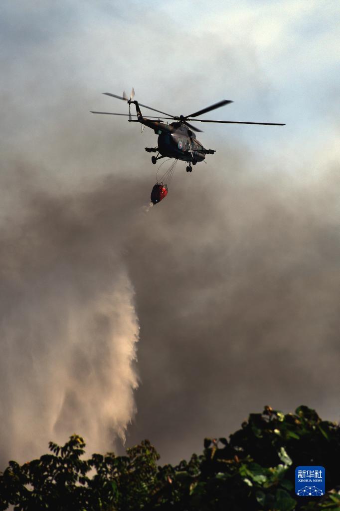 8月8日,在古巴馬坦薩斯省,消防直升機(jī)在火災(zāi)現(xiàn)場(chǎng)作業(yè)。