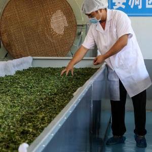 8月9日,工作人員在石阡縣楓香鄉(xiāng)梨子園村茶葉加工廠內檢查茶青。