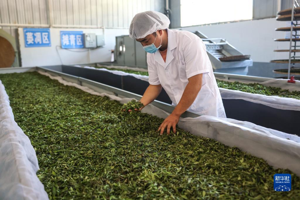 8月9日,工作人員在石阡縣楓香鄉梨子園村茶葉加工廠內對茶葉進行萎凋。