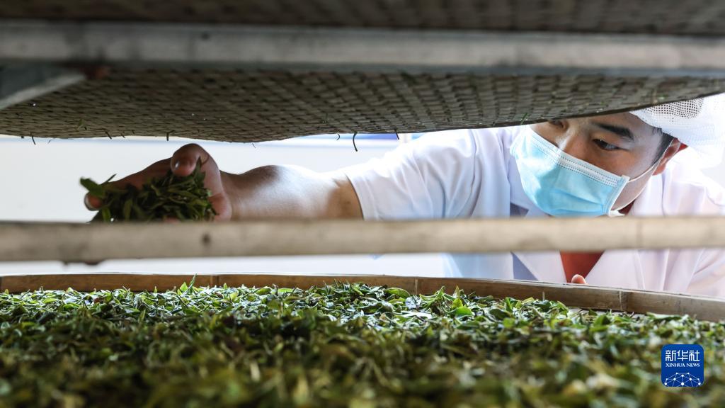 8月9日,工作人員在石阡縣楓香鄉(xiāng)梨子園村茶葉加工廠內(nèi)對(duì)茶青進(jìn)行攤晾。