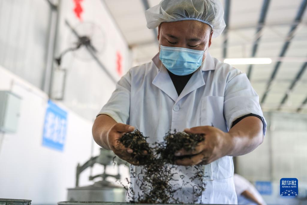 8月9日,工作人員在石阡縣楓香鄉梨子園村茶葉加工廠內對茶葉進行烘干。
