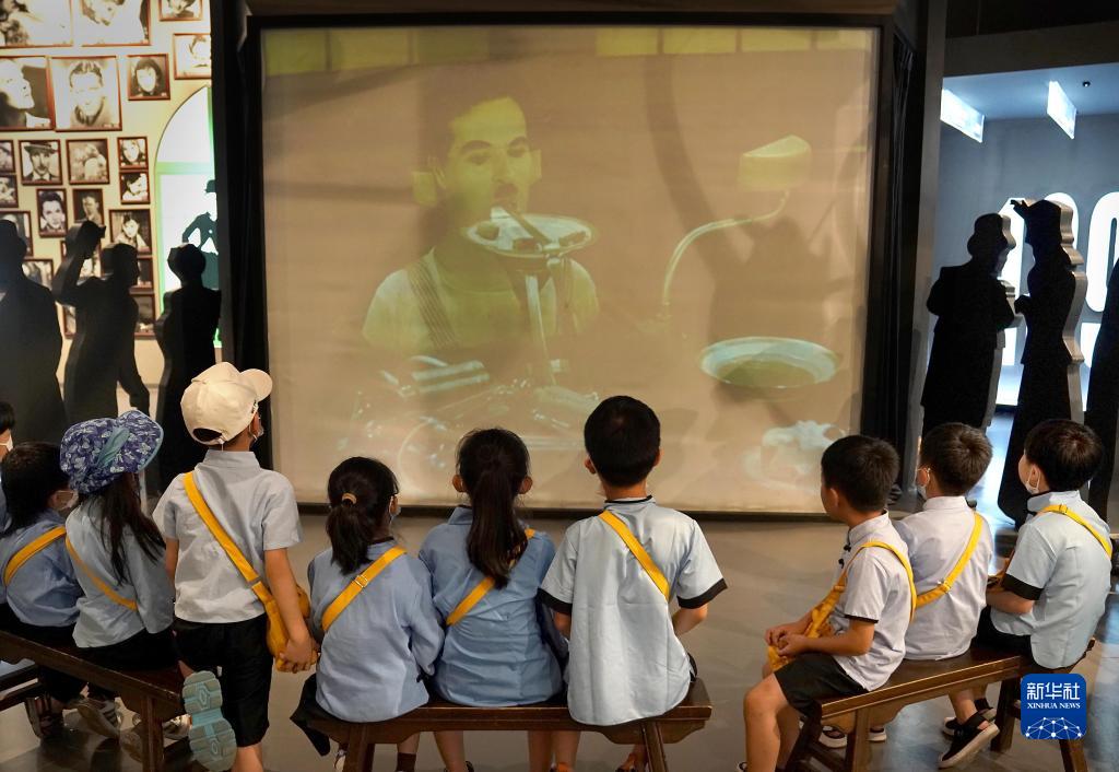 參加研學(xué)班的孩子們在電影小鎮(zhèn)里觀看電影作品(8月6日攝)。