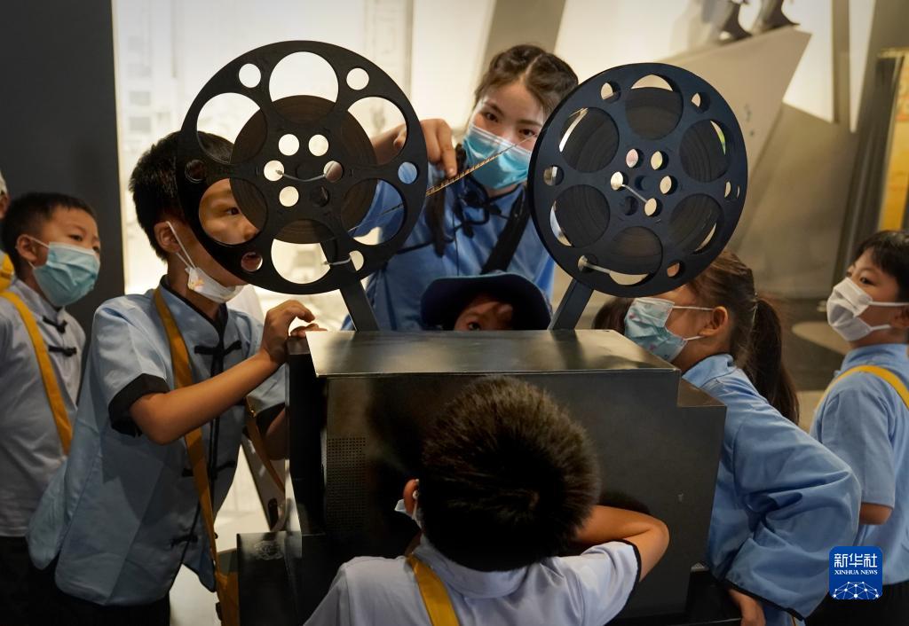 研學(xué)班的老師在電影小鎮(zhèn)里為孩子們講解老式電影放映機(jī)(8月6日攝)。