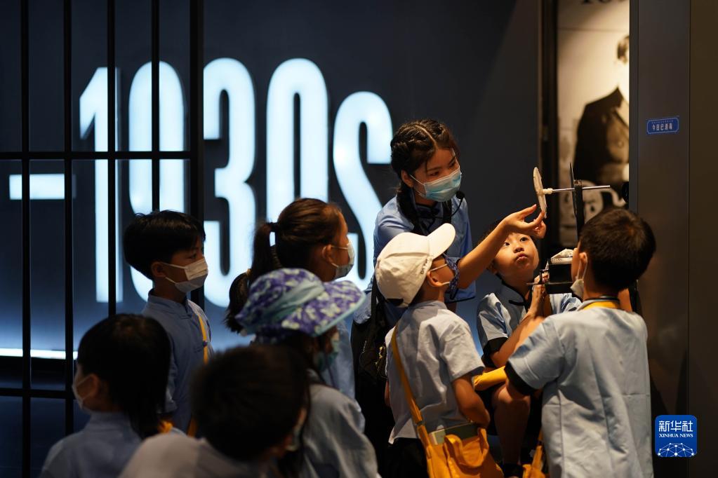 老師帶領研學班的孩子們在電影小鎮里操作實驗設備,了解電影原理(8月6日攝)。