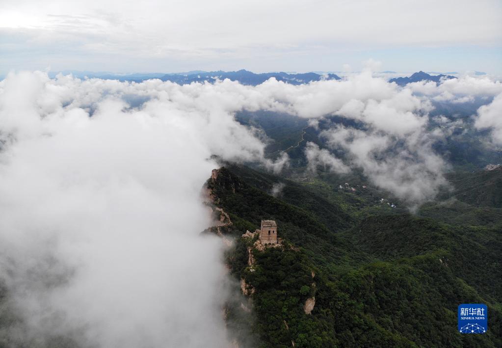 8月9日拍攝的金山嶺長城云海景觀(無人機照片)。