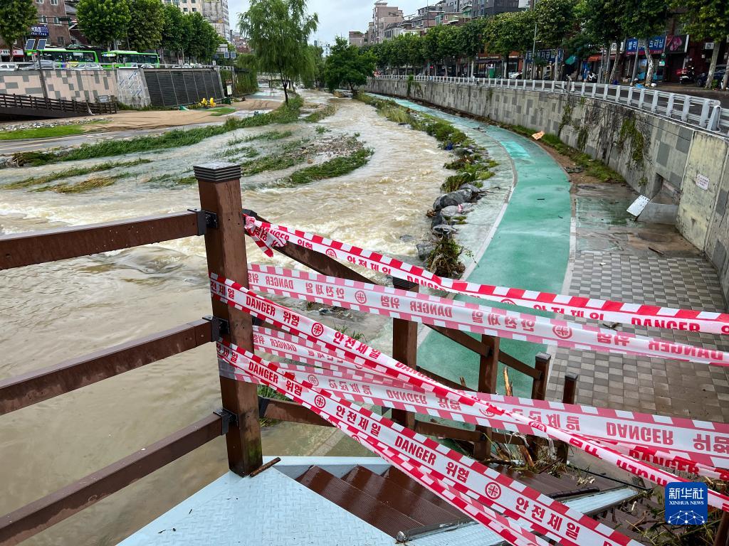 8月9日,受強降雨影響,韓國首爾一條河流旁的人行步道被封閉(手機拍攝)。