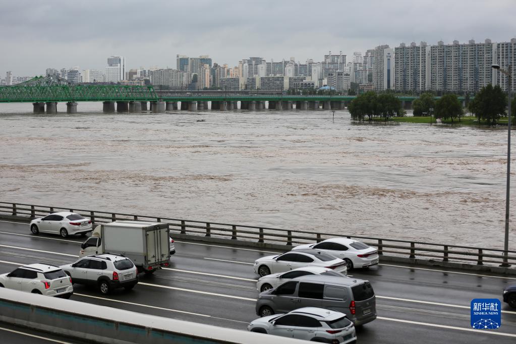 8月9日,車輛在韓國首爾的沿江公路上行駛,旁邊是受強降雨影響而水位上漲的漢江。
