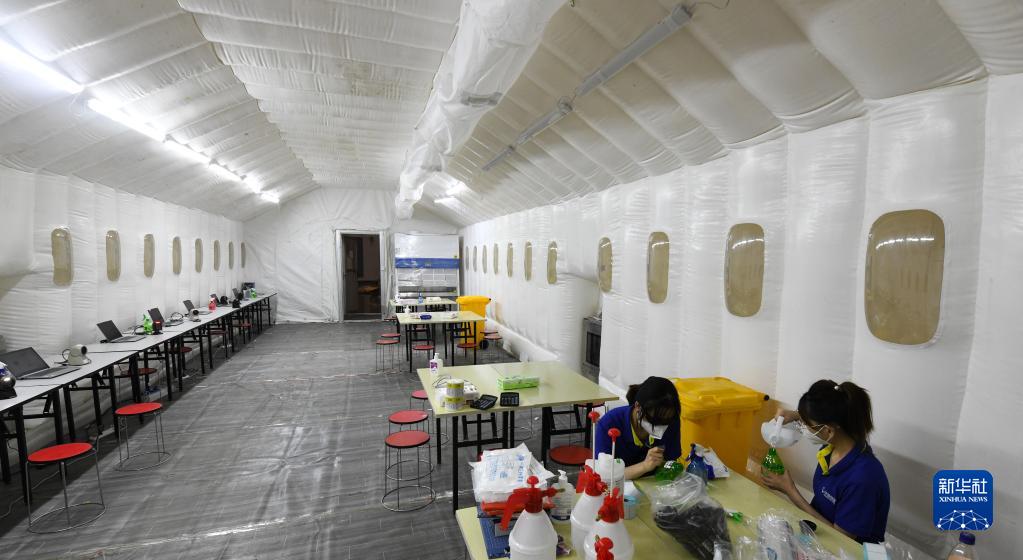 8月9日,江蘇省核酸檢測(cè)隊(duì)工作人員在實(shí)驗(yàn)室投入使用前做準(zhǔn)備工作。