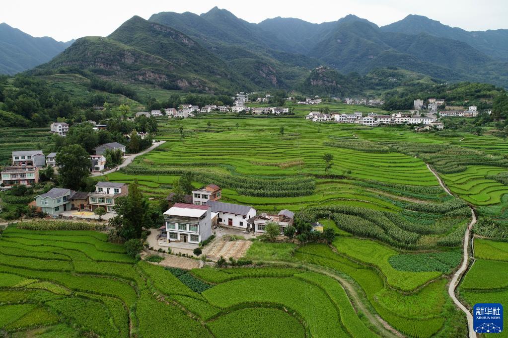 這是8月9日拍攝的陜西省漢陰縣漩渦鎮鳳堰古梯田一景(無人機照片)。