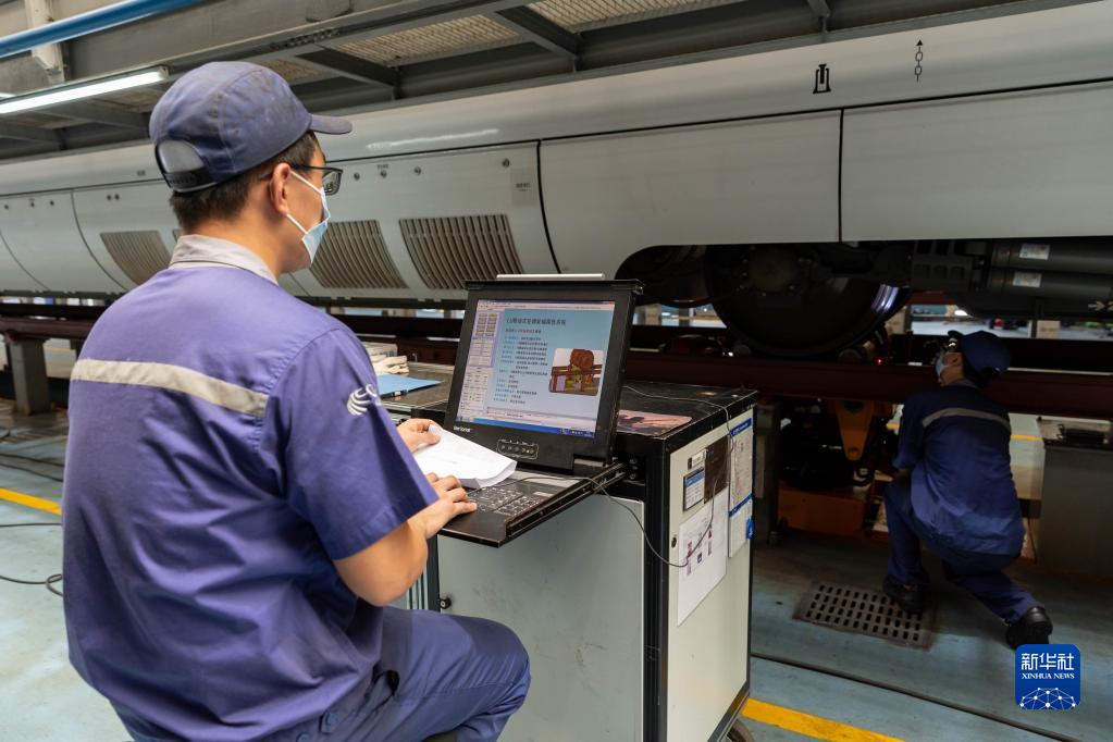 8月10日,探傷工(左)對動車組輪輞輪輻進行探傷作業。 新華社記者 王翔 攝