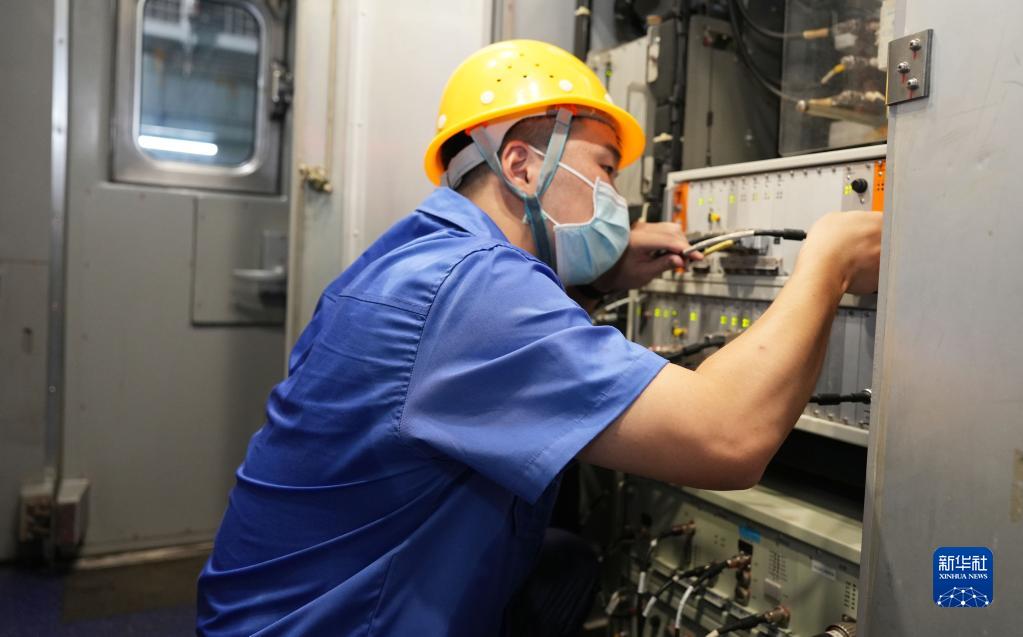在中國鐵路上海局集團有限公司南京動車所內,南京電務段動車車載設備車間工作人員檢修動車行車記錄設備(8月3日攝)。