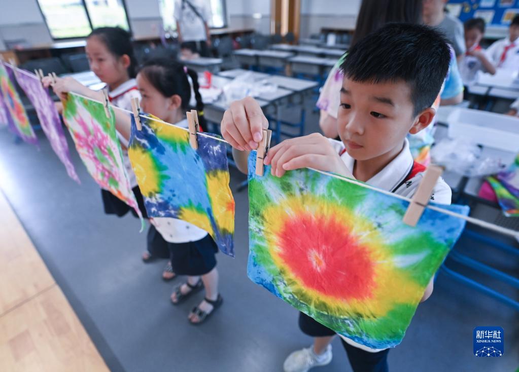 8月10日,湖州市吳興實驗小學的學生把做好的扎染作品掛在教室里。 新華社記者 徐昱 攝