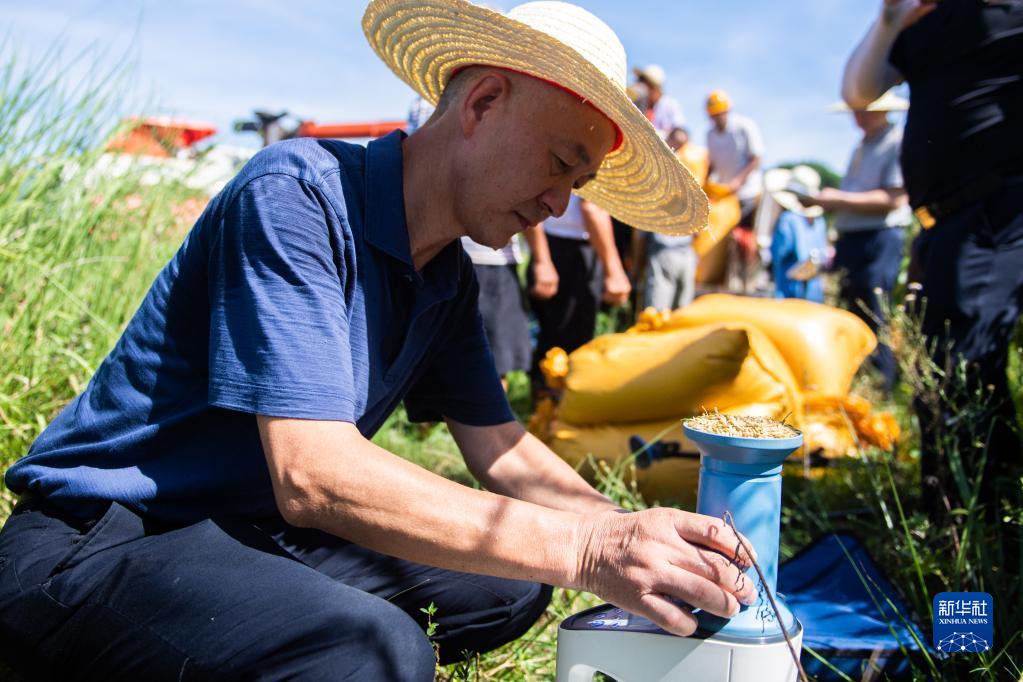 8月10日,在 “一季雜交稻+再生稻”生產(chǎn)模式寧鄉(xiāng)示范基地頭季稻測產(chǎn)驗收現(xiàn)場,工作人員檢測稻谷含水量。