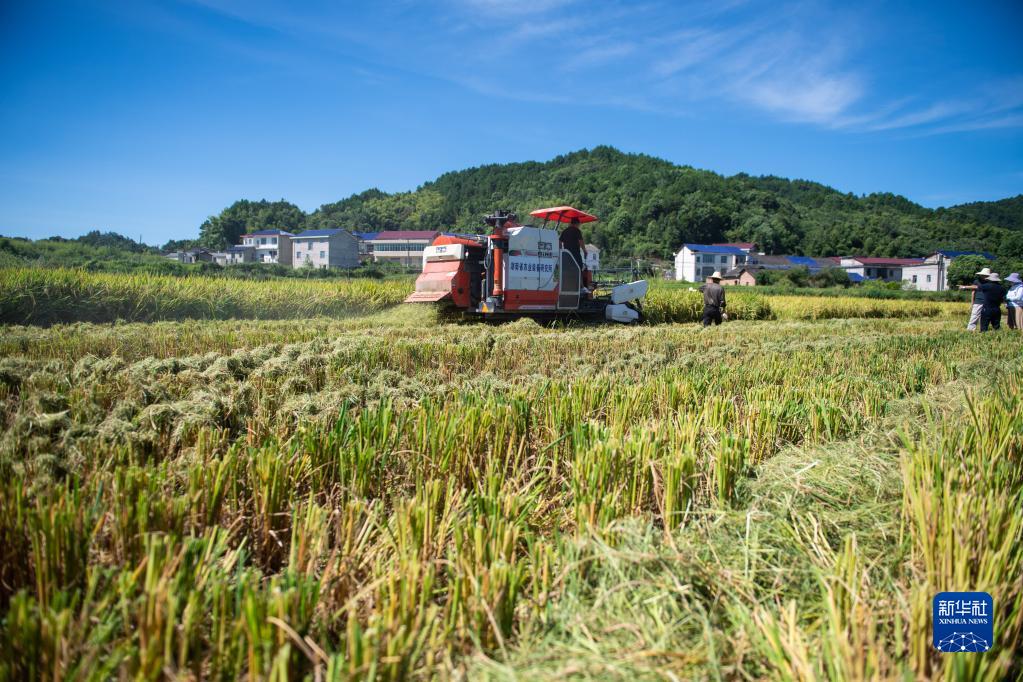 8月10日,在 “一季雜交稻+再生稻”生產(chǎn)模式寧鄉(xiāng)示范基地頭季稻測產(chǎn)驗(yàn)收現(xiàn)場,工作人員駕駛農(nóng)機(jī)收割水稻。