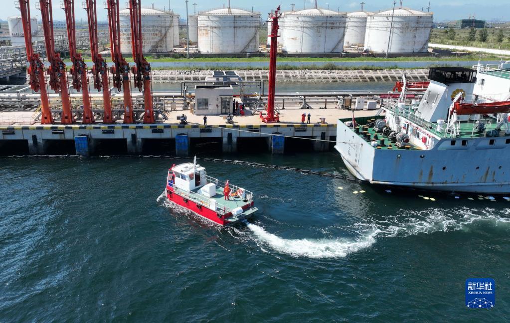 8月10日,參演船舶在危險品碼頭船舶溢油應急處置聯合演習中(無人機照片)。