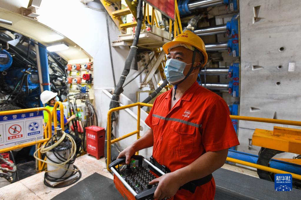 8月10日,施工人員在深江鐵路珠江口隧道操作管片安裝設備。 新華社記者 劉大偉 攝
