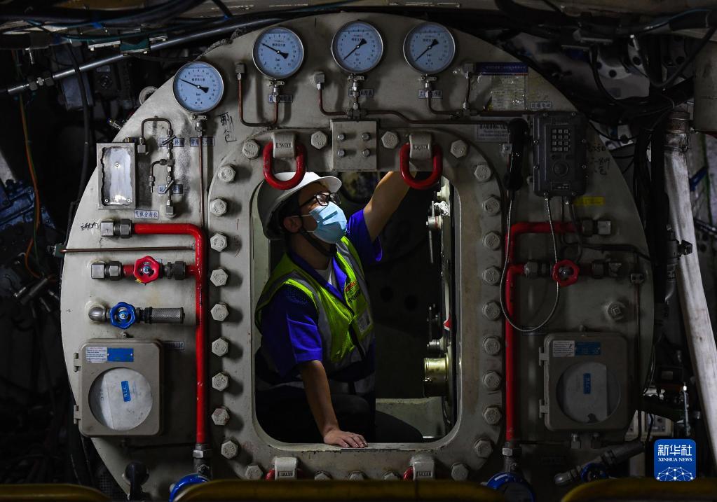 8月10日,施工人員在深江鐵路珠江口隧道檢查“深江1號”盾構機運行狀況。 新華社記者 劉大偉 攝