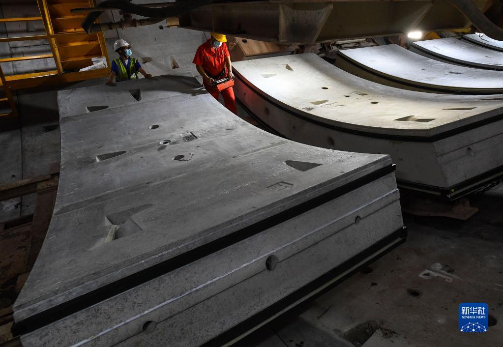 8月10日,施工人員在深江鐵路珠江口隧道操作運輸管片。 新華社記者 劉大偉 攝
