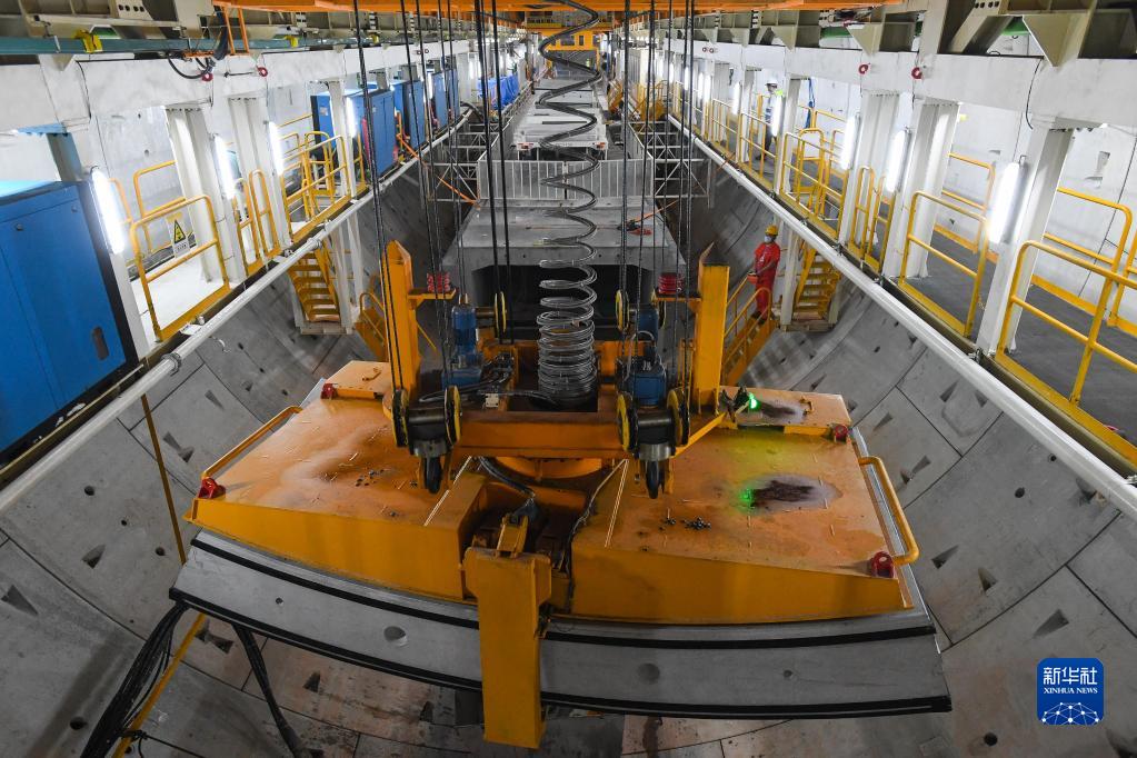 8月10日,施工人員在深江鐵路珠江口隧道吊運管片。 新華社記者 劉大偉 攝