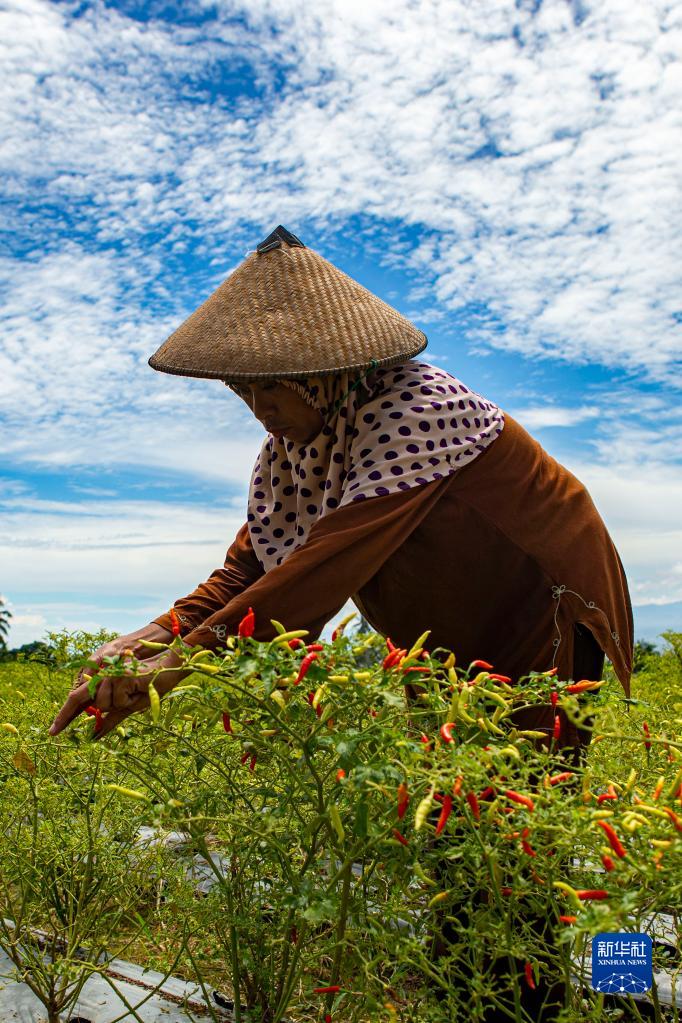 8月10日,農(nóng)民在印度尼西亞中蘇拉威西省帕盧的辣椒地里收獲辣椒。