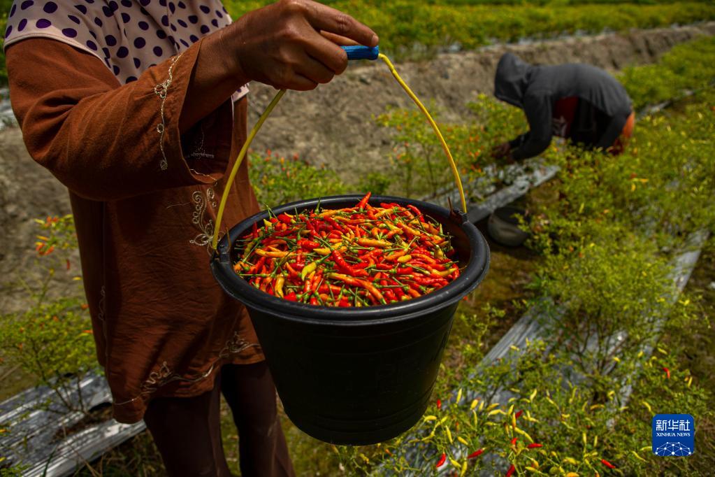 8月10日,在印度尼西亞中蘇拉威西省帕盧的辣椒地里,農民展示收獲的辣椒。