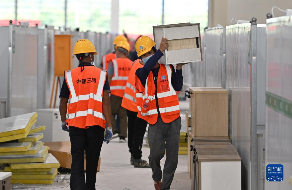 8月10日,工人在三亞第二方艙醫院作業。