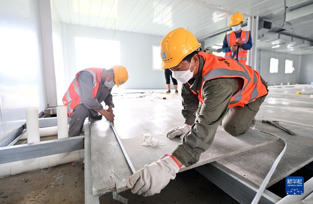8月10日,工人在三亞第二方艙醫院作業。