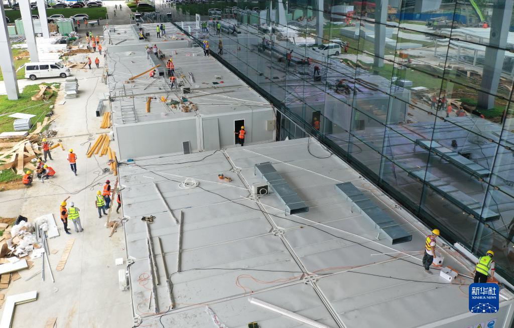 8月10日,工人在三亞第二方艙醫院作業(無人機照片)。