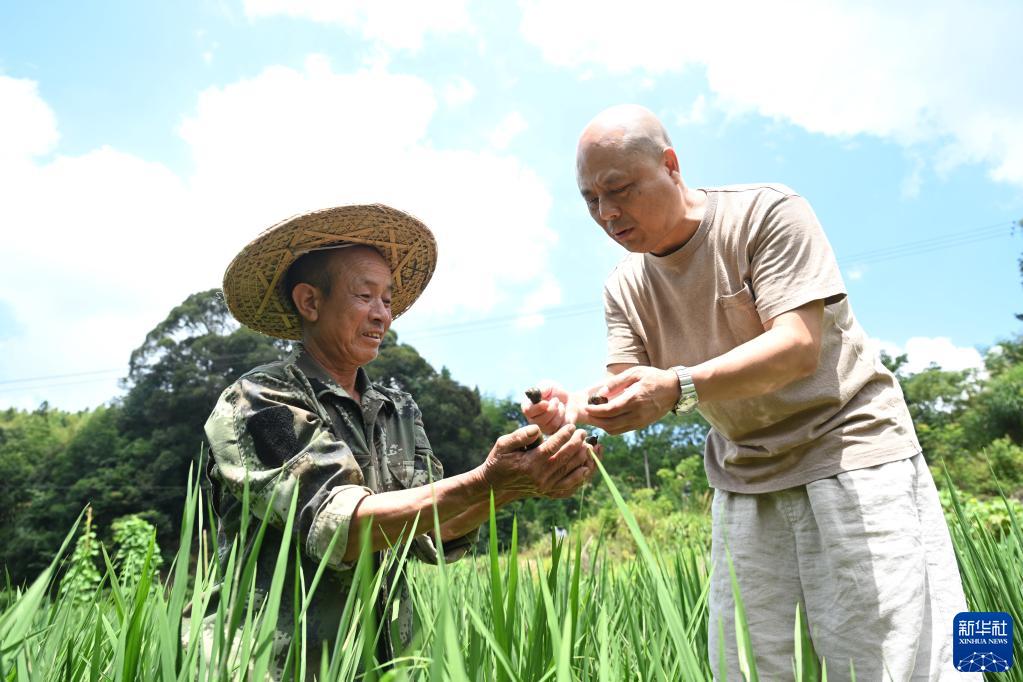 8月9日,農業推廣研究員練進旺(右)在迪口鎮店村村一處稻螺種養田指導農民鄭智富采收田螺。