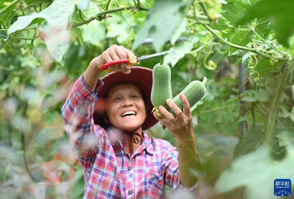 8月9日,村民在建甌市迪口鎮(zhèn)可建村富民農(nóng)業(yè)生態(tài)觀光園采摘絲瓜新品種。